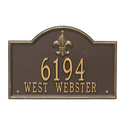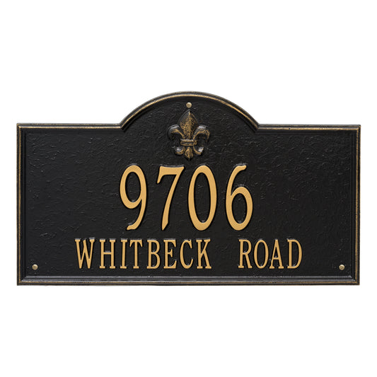 The fleur-de-lis emblem on this personalized address sign creates a distinctive style reminiscent of French Country and New Orleans.